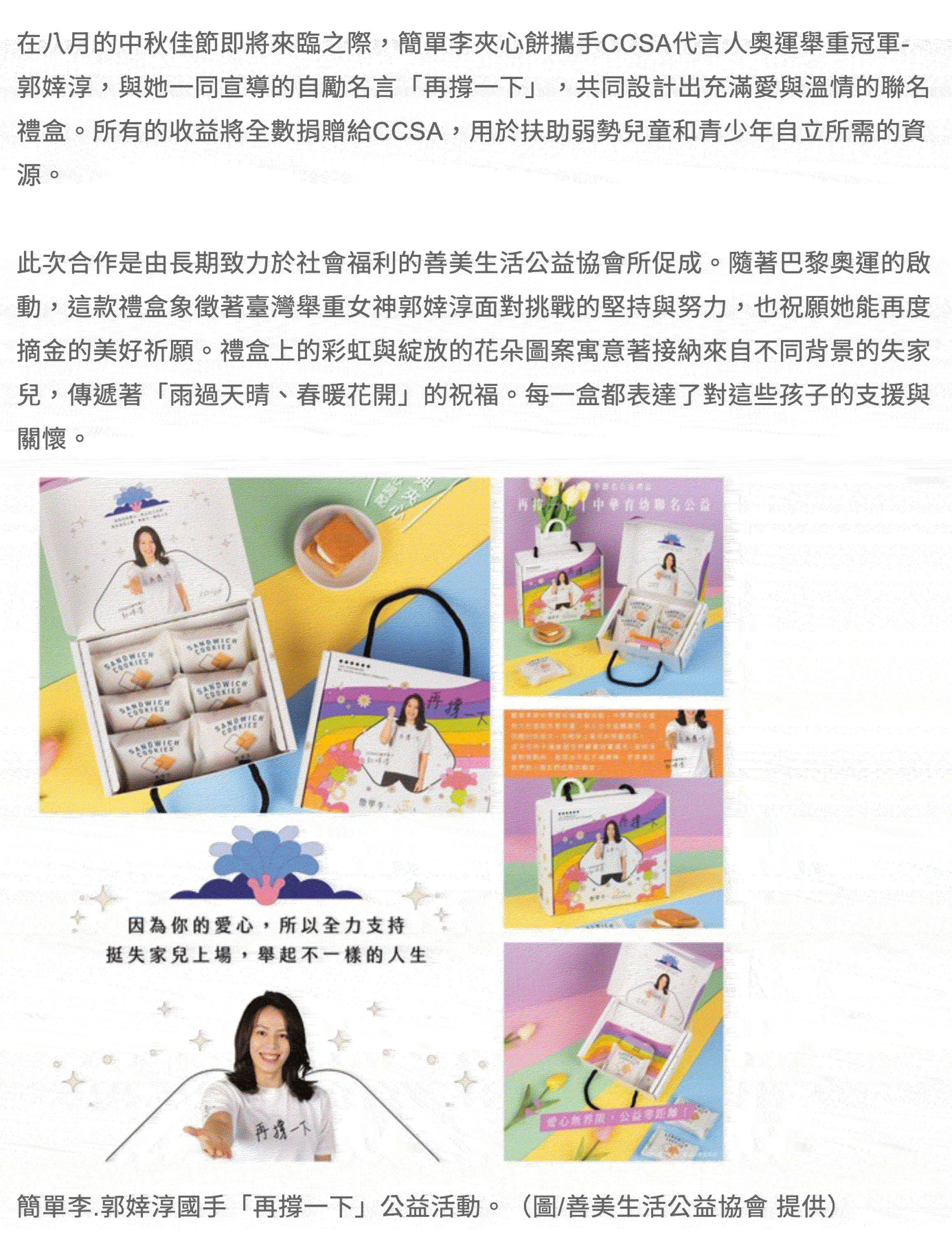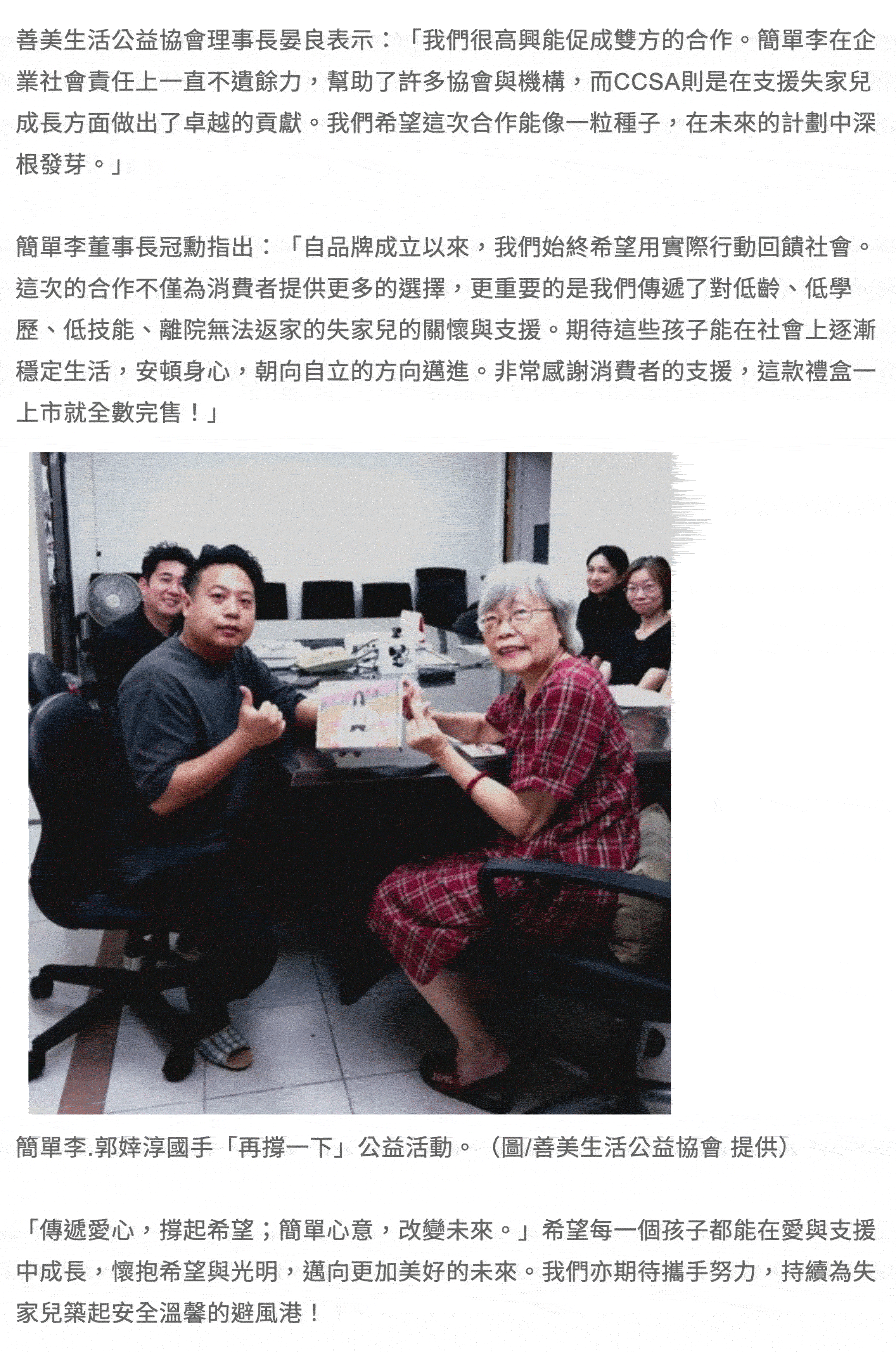 即日起只要官網下單【再撐一下】聯名禮盒,簡單李就會將全部收益捐贈給中華育幼協會,一起傳遞愛與力量,為孩子們的未來加油!