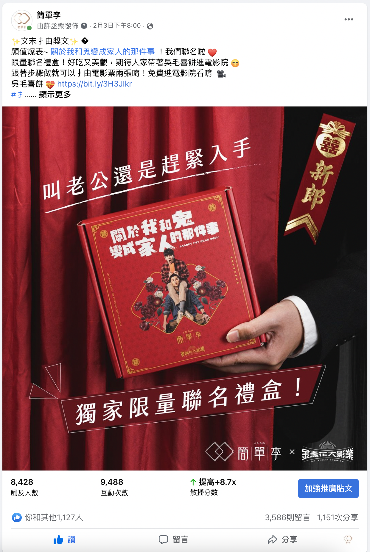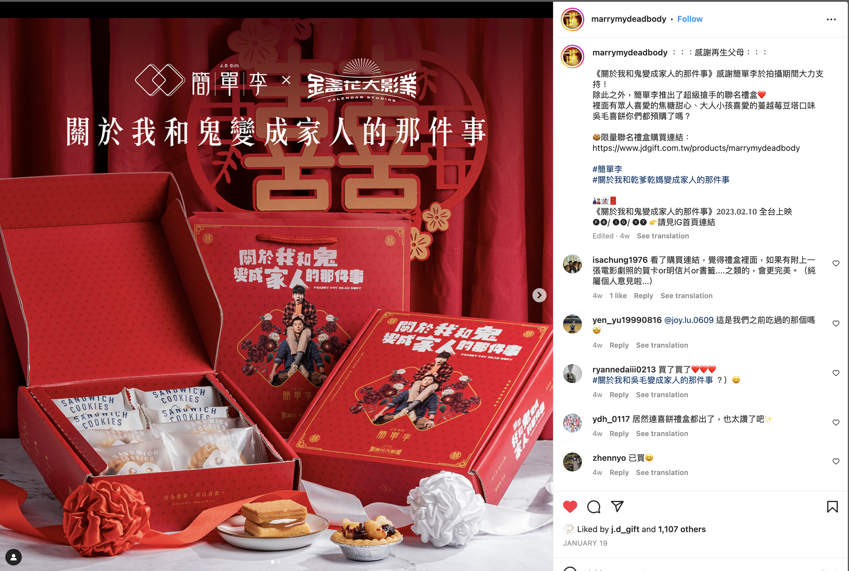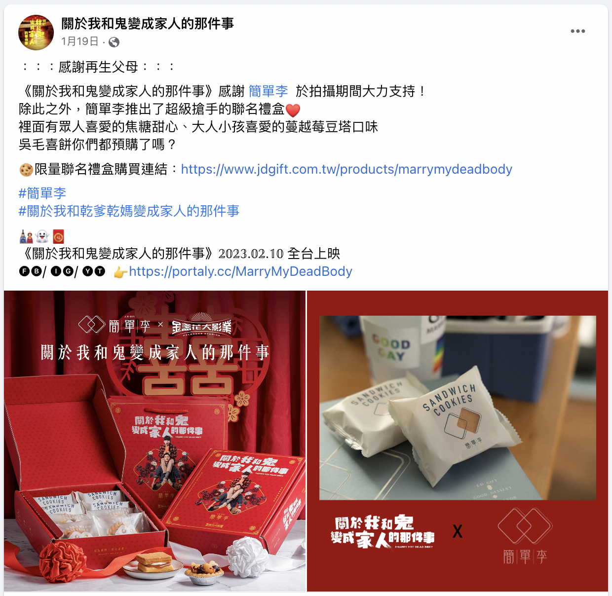 簡單李這次跟金盞花大影業合作啦!❤️ 關於我和鬼變成家人的那件事,恐同男警吳明翰,誤撿地上紅包,沒想到紅包裡的對象是個男的!被迫男男冥婚的明翰,一場荒謬絕倫、笑中帶淚的旅程就此展開!一定要入手限量聯名禮盒,邊吃邊看電影啊 🎬