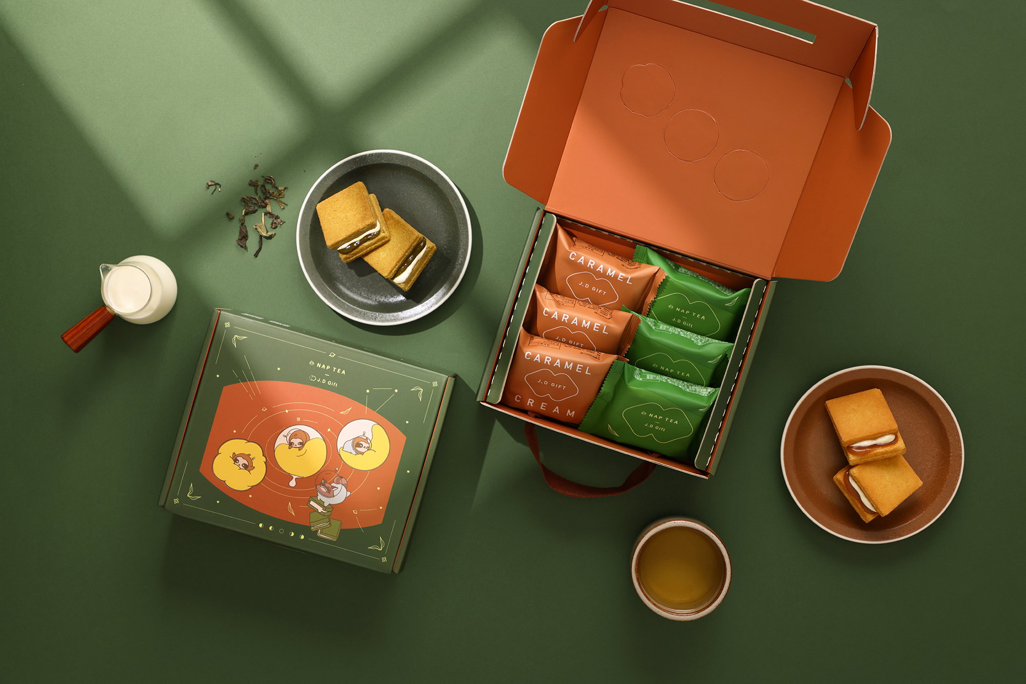 除了限定口味「棉被午茉綠奶油夾心餅」,這次禮盒也收錄人氣不敗的經典款──焦糖奶油夾心餅。任何時刻都能療癒您的心!