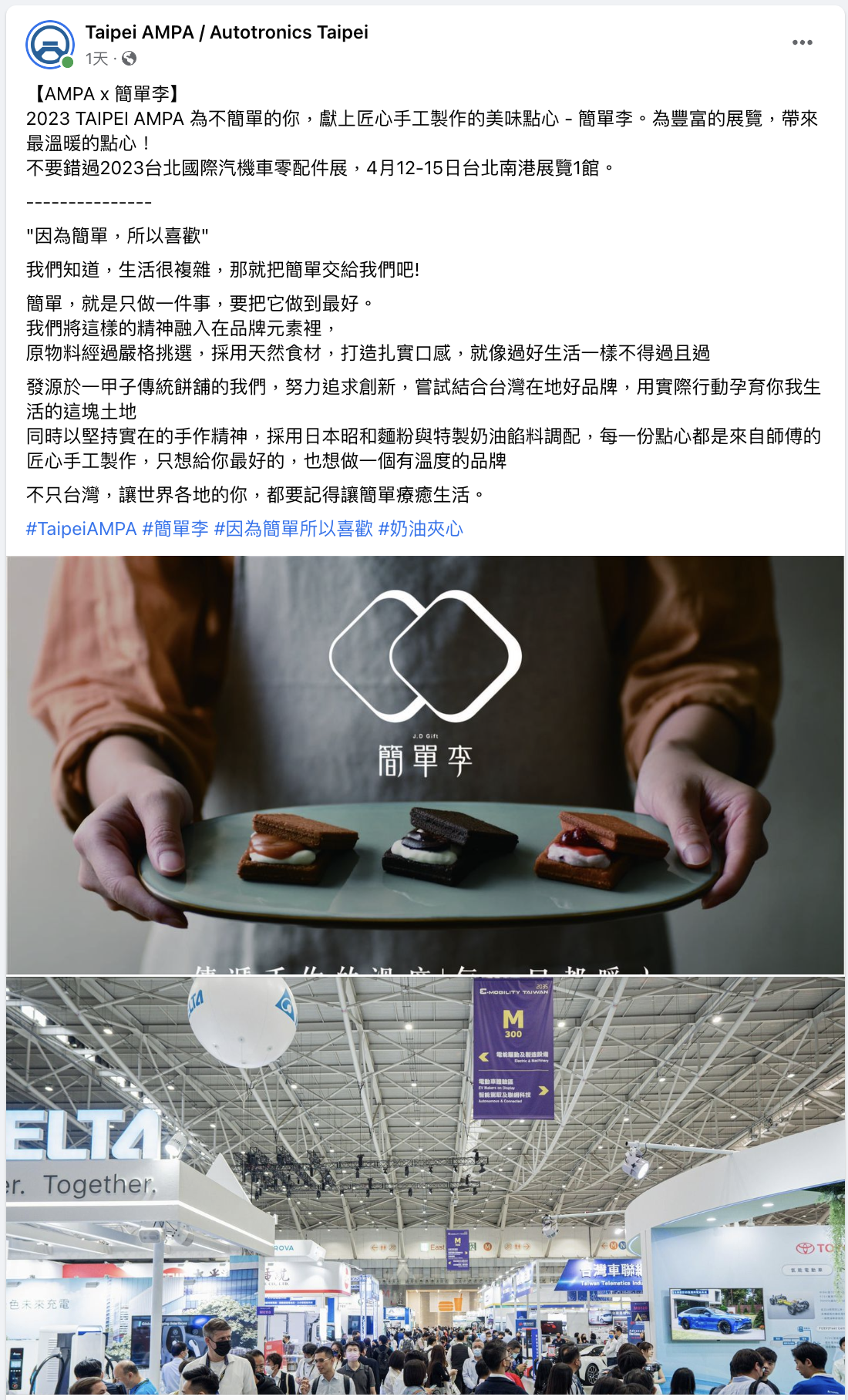 「台北國際汽機車零配件展(TAIPEI AMPA)」每年在4月舉辦,2023年即將邁入第39屆,伴隨產業一起由傳統汽車零組件工業走入未來自駕及電動車的時代,同期展出「台北國際車用電子展(Autotronics Taipei)」,為亞洲唯一結合汽、機車零配件及車用電子、電動車及智慧運輸之國際指標B2B展覽。展出汽機車產業全球趨勢及人氣話題-電動車相關產品。為亞洲第2大、全球第4大汽機車零配件展。同期辦理的電動車及車聯網國際論壇亦為展覽重要看點之一。
