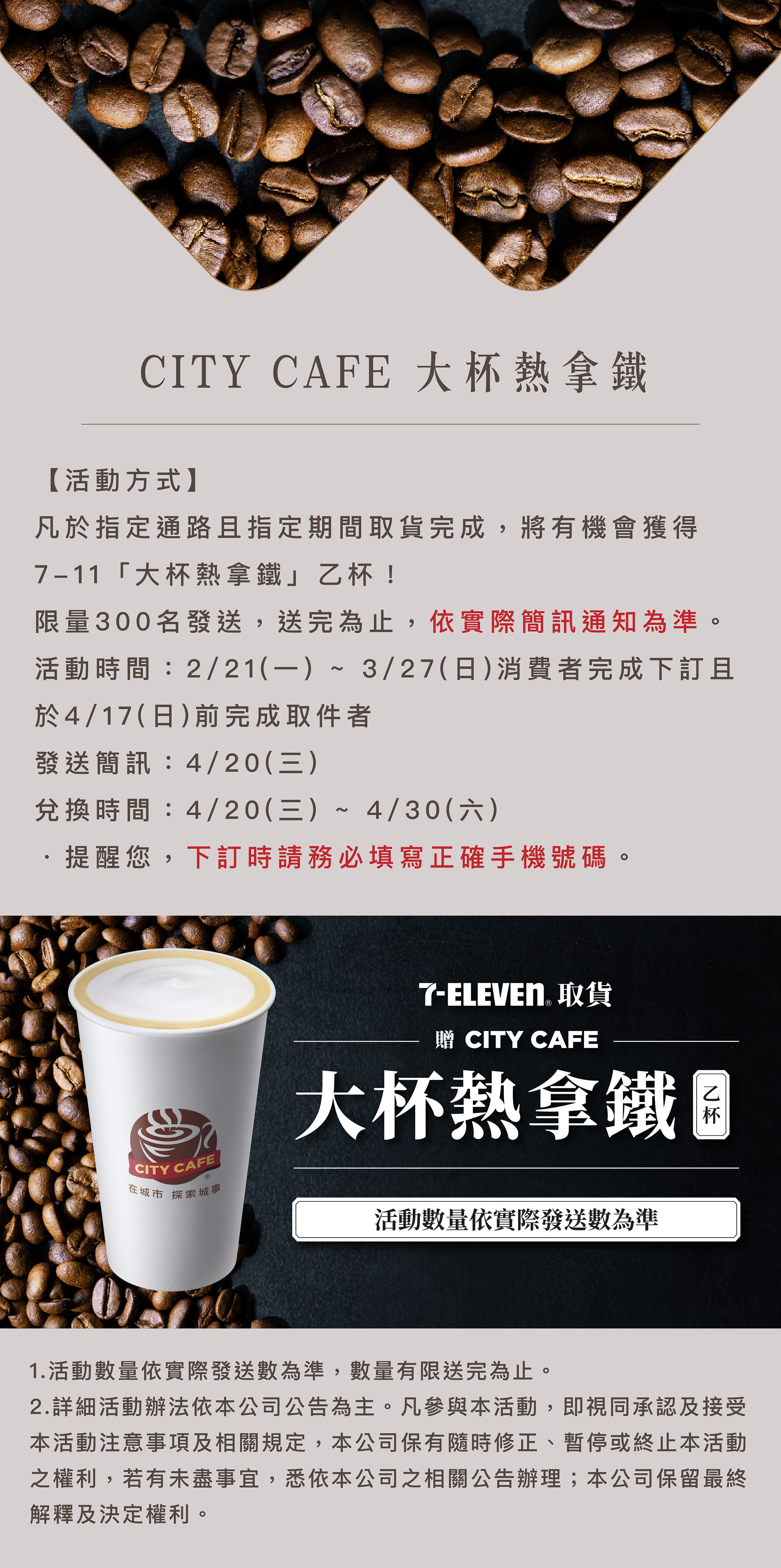 2.憑紙本咖啡兌換券至櫃檯,即可換得 CITY CAFE 大杯熱拿鐵 乙杯。