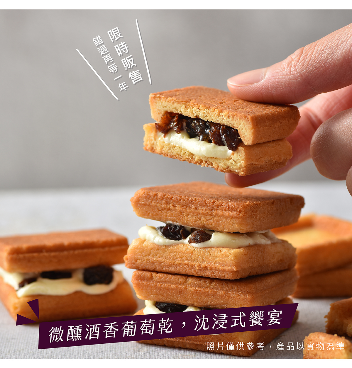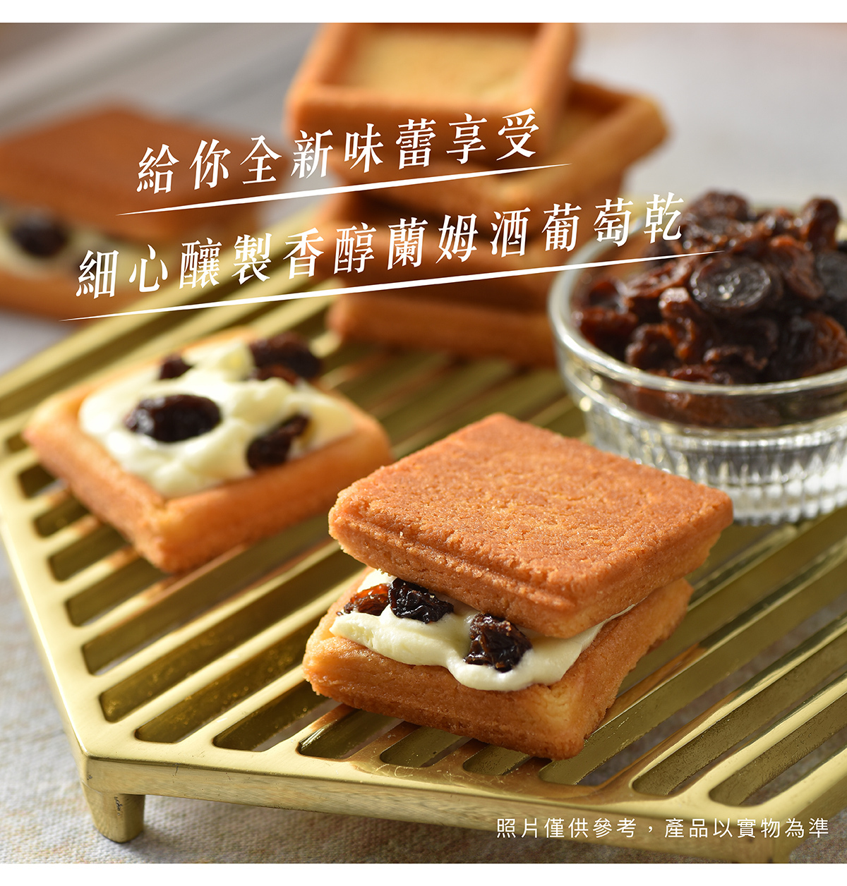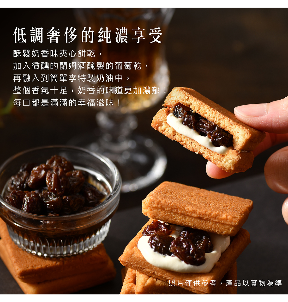 酥鬆奶香味夾心餅乾和特製過後的餡料,用蘭姆酒醃製後將葡萄的香氣提升,光葡萄就有不同的滋味展現,