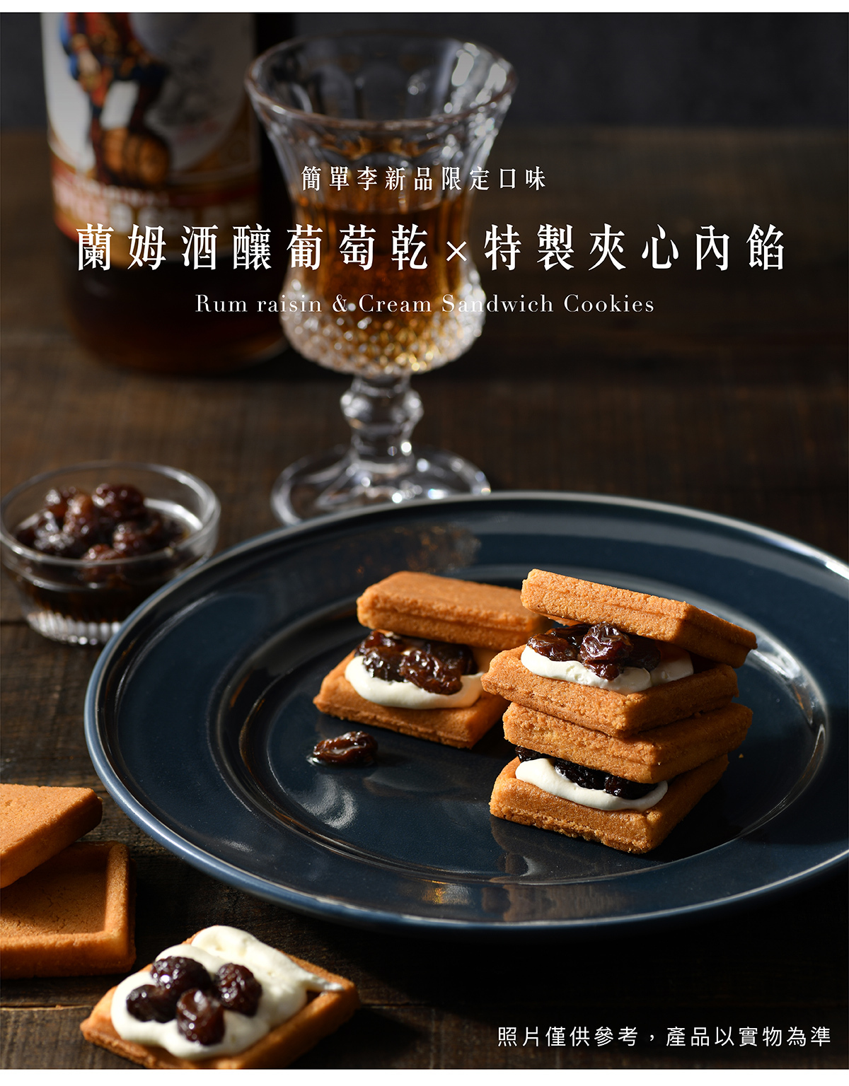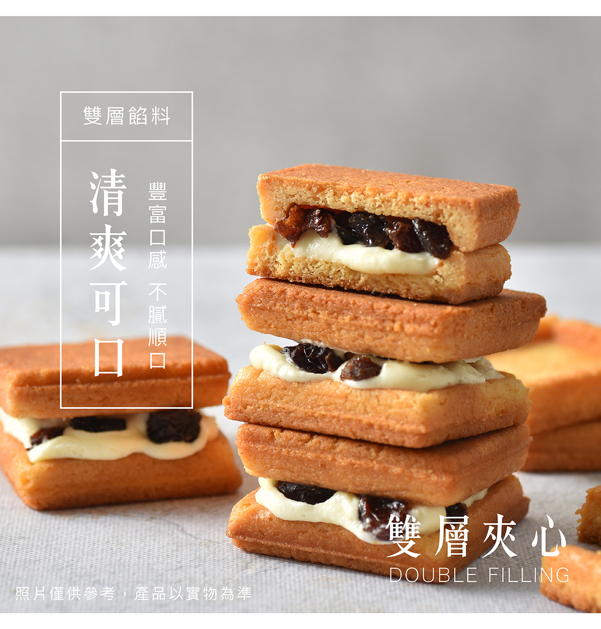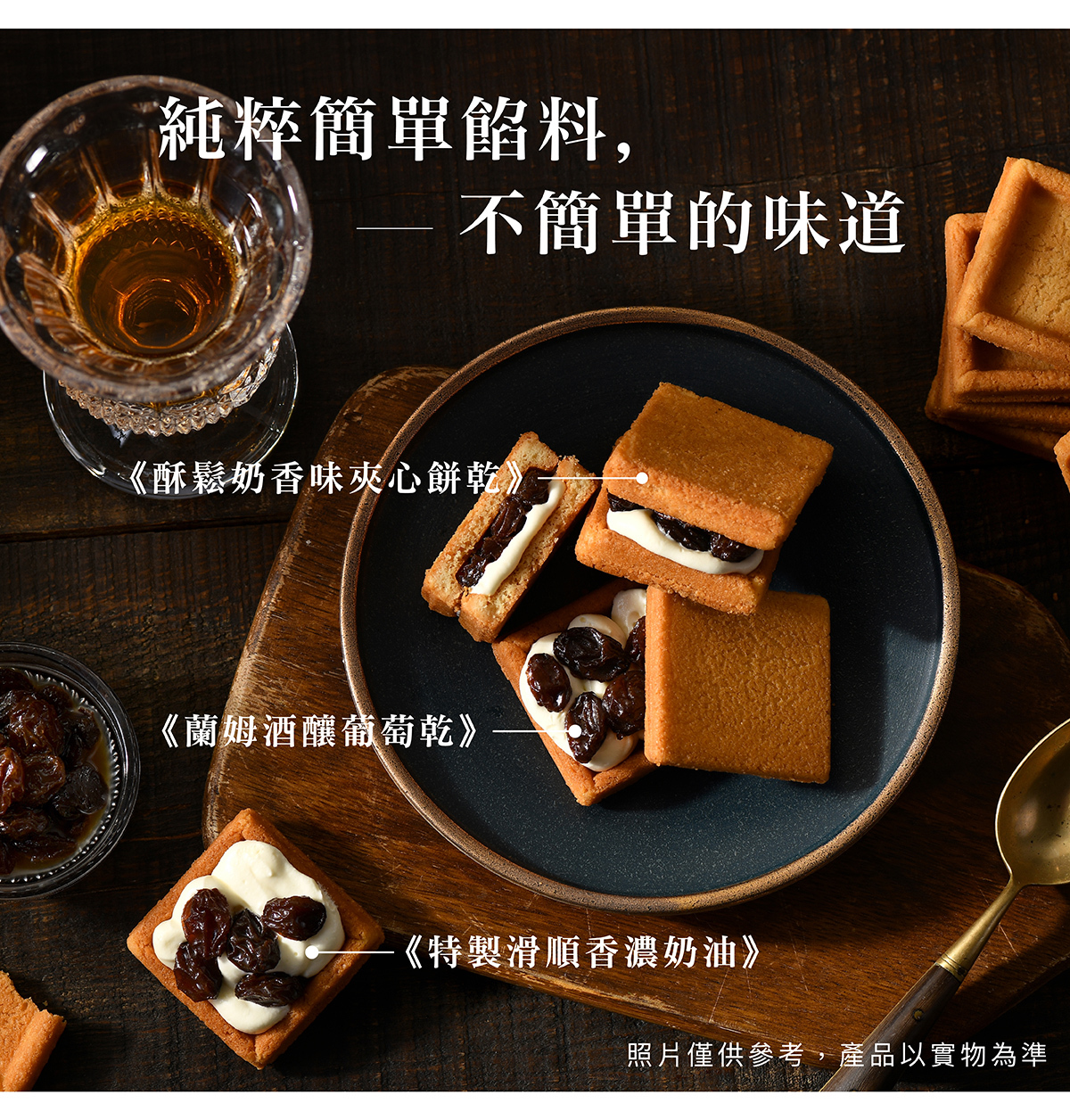 酥鬆奶香味夾心餅乾和特製過後的餡料,用蘭姆酒醃製後將葡萄的香氣提升,光葡萄就有不同的滋味展現,