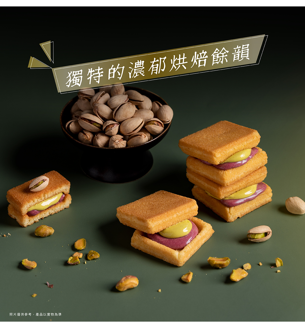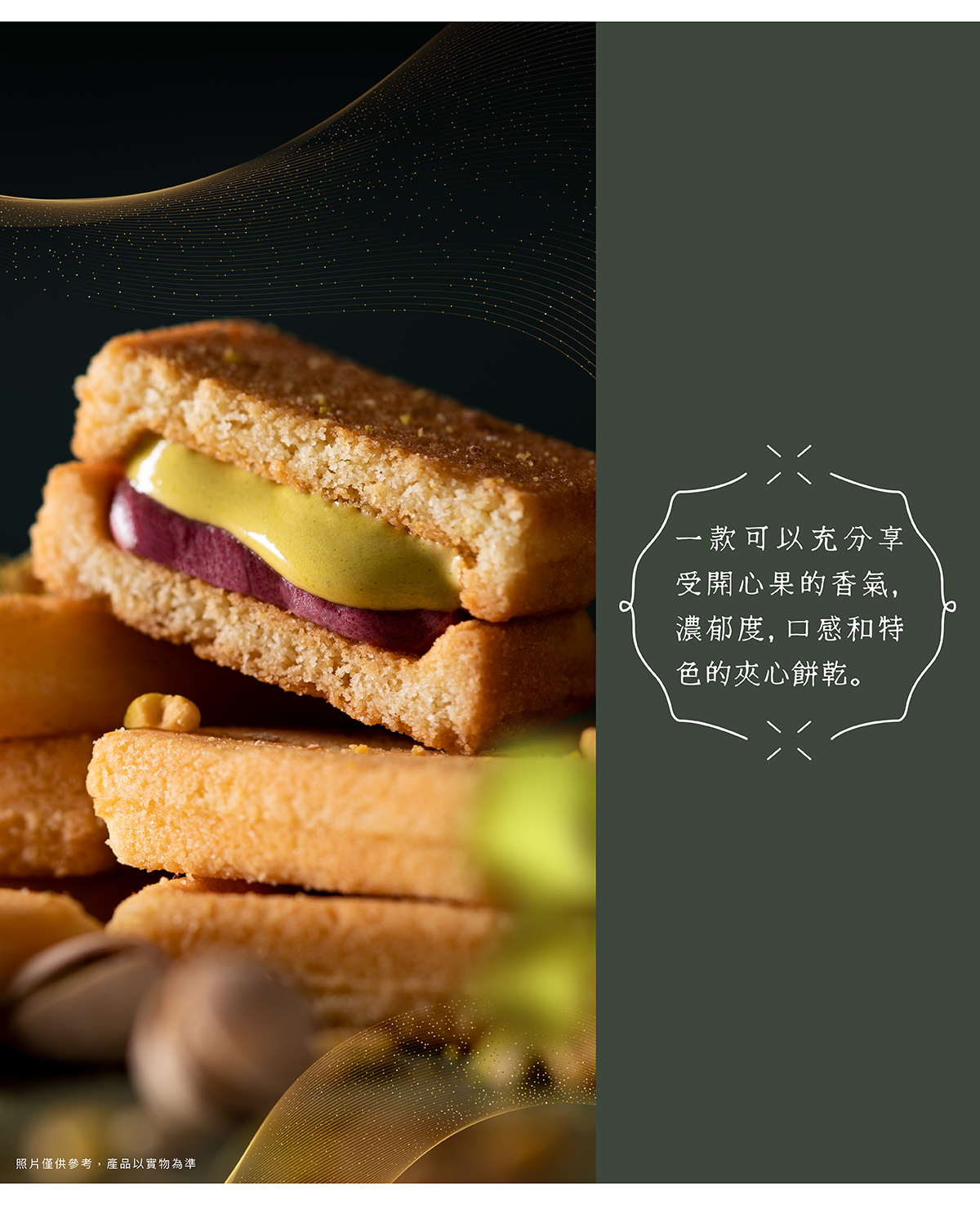 讓您樂在口中,幸福綿延,是話家常的必備茶食。精心烘焙的雙層夾心餅,口感香甜酥脆,特地搭配圓滿寓意的開心果,佐以莓果奶油與紅寶石巧克力入味,象徵著紅色喜氣,蘊含著我們的祝福,是過年送禮第一首選!