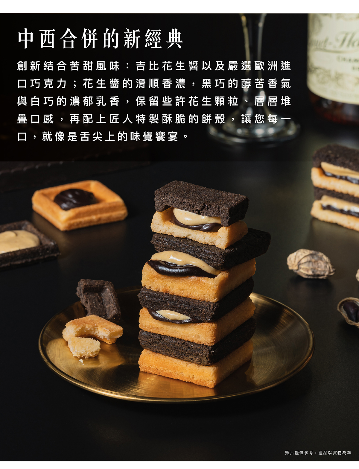 花生醬的滑順香濃,黑巧的醇苦香氣與白巧的濃郁乳香,保留些許花生顆粒、層層堆疊口感,再配上匠人特製酥脆的餅殼,讓您每一口,就像是舌尖上的味覺饗宴。