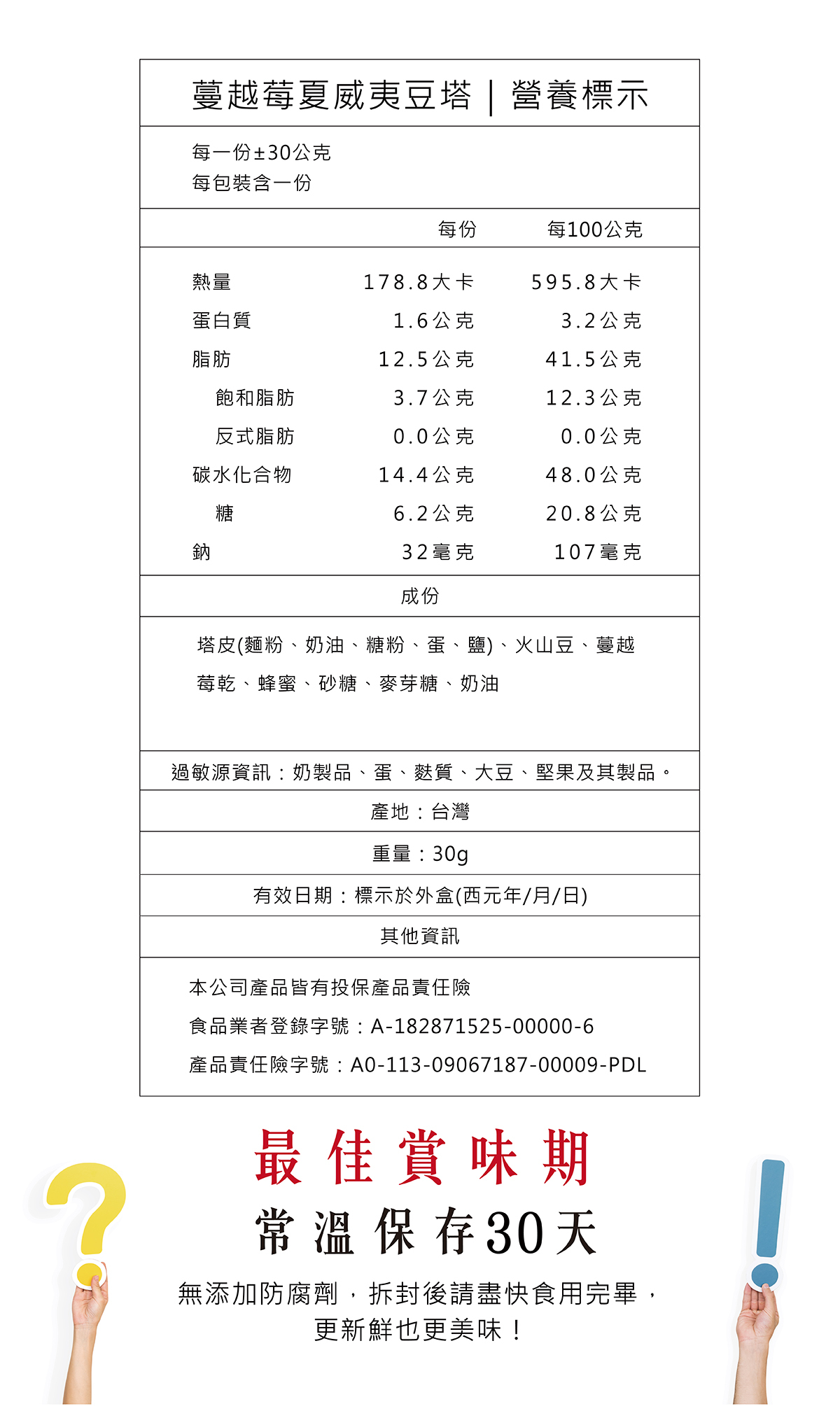 內容物:蔓越莓夏威夷豆塔 / 共一盒(8入/盒)