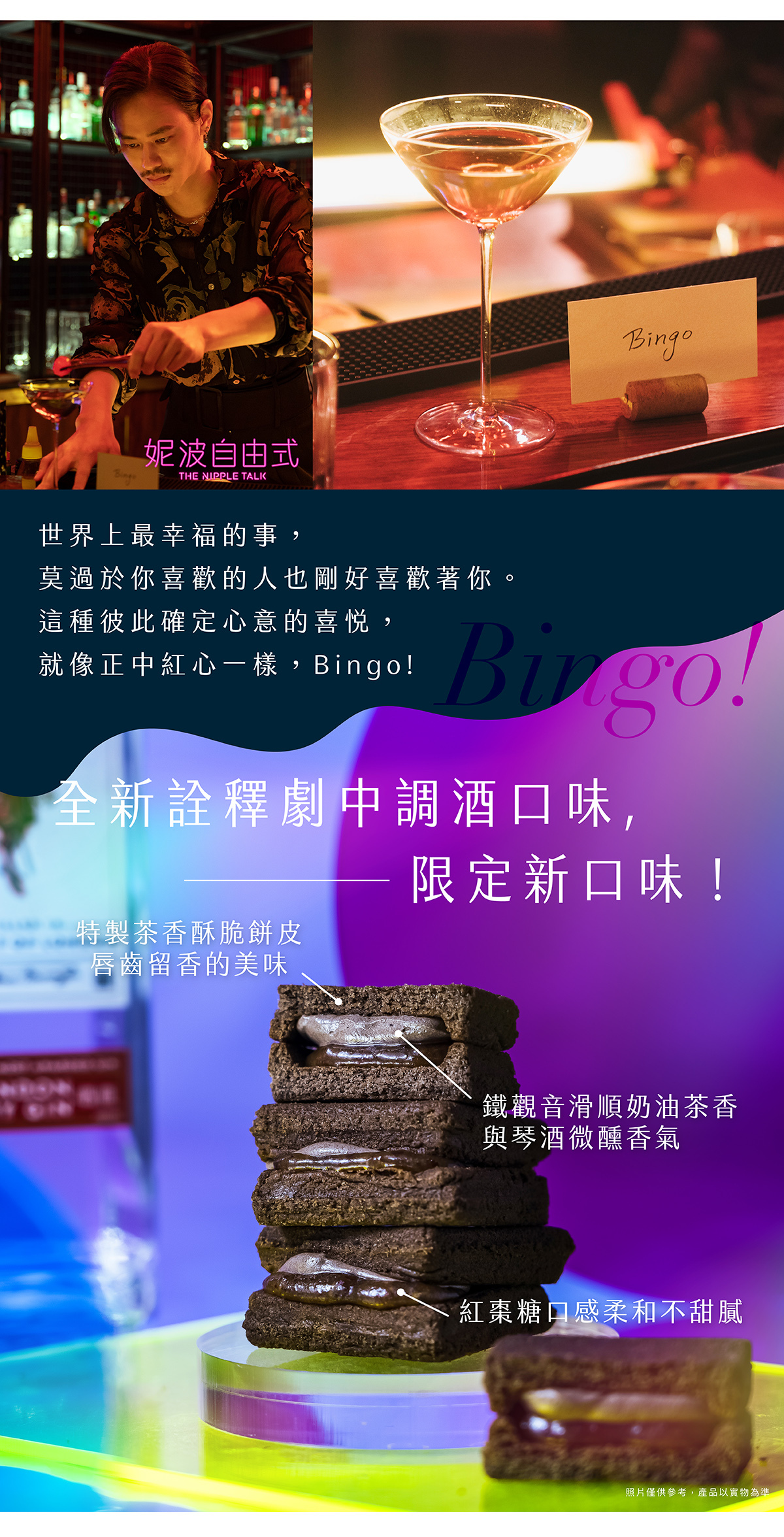 妮波自由式 2024年度最有事的都會愛情性喜劇!跨界影劇聯名合作!全新詮釋劇中調酒口味~讓你ㄧ邊追劇一邊享受甜點美味。愛自己的樣式;用簡單來詮釋!採用"坪林"鐵觀音茶葉製成餅皮,酥脆中帶有濃郁茶香;每一口感受清新韻味,茶香滑順奶油與琴酒的微醺風味結合,細膩且層次豐富;獨特風味紅棗糖,口感柔和不搶戲~ 適合送給最有事的閨蜜朋友!
