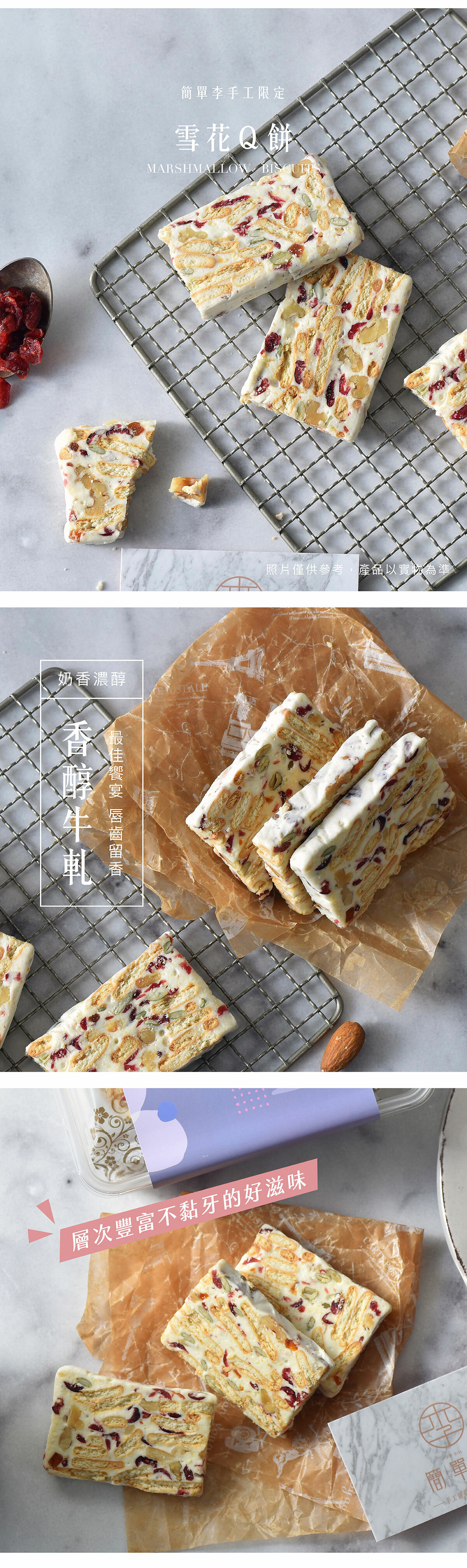 牛軋糖加上堅果跟水果製作而成,一口咬下餅體還有一點酥脆感,