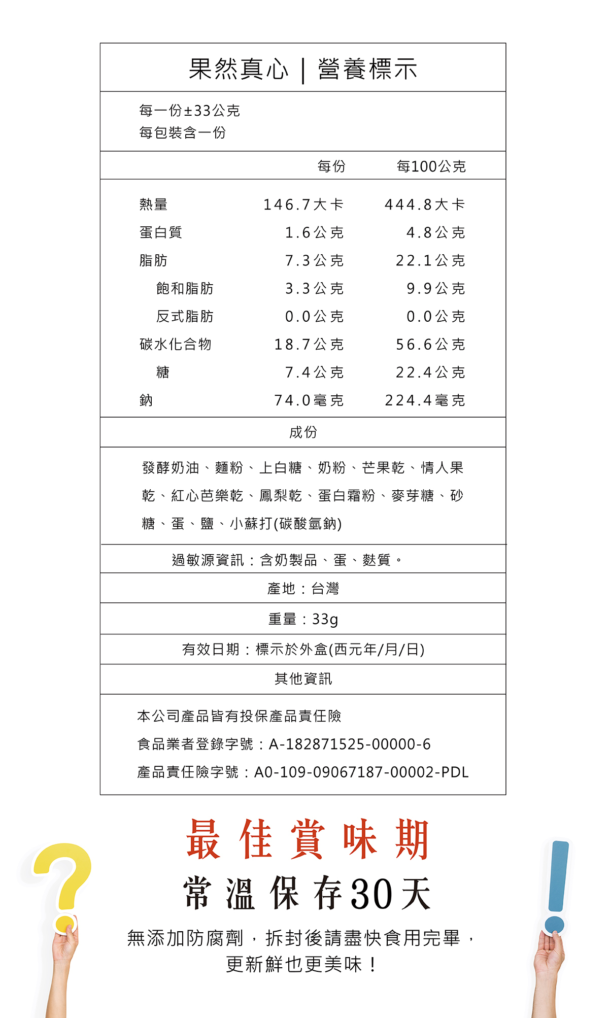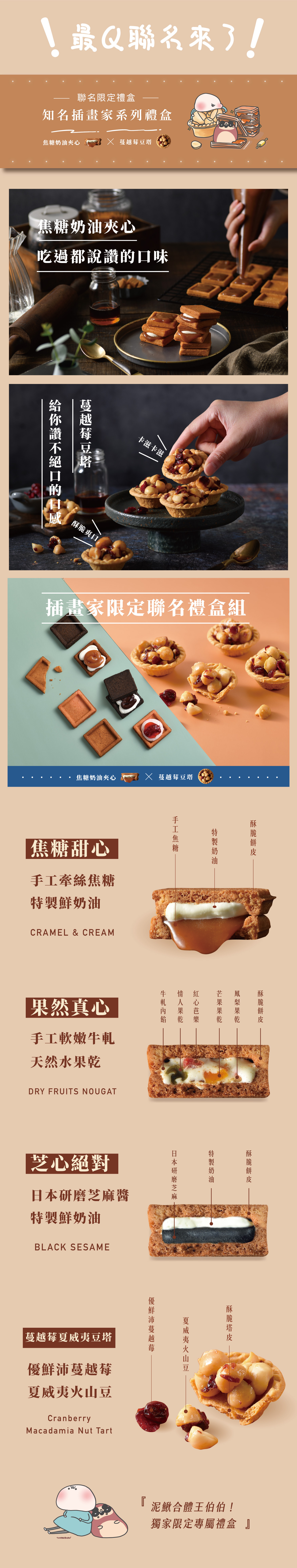 內容物:蔓越莓夏威夷豆塔4顆+焦糖甜心 / 果然真心 / 芝心絕對(擇一口味,計8顆) / 共1盒/12入
